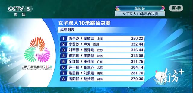 陈芋汐掌敏洁获得十五运会跳水女子双人10米台金牌,全红婵王伟莹获得第五名