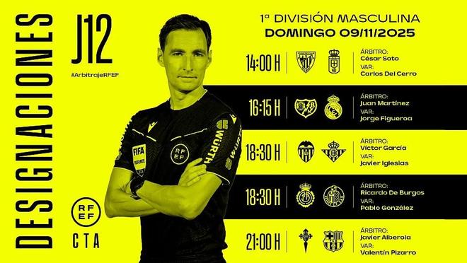 西班牙足协官方公布了周日西甲5场比赛的裁判名单,胡安-马丁内斯将执法巴列卡诺vs皇马,哈维尔-阿尔韦罗拉将执法塞尔塔vs巴萨。