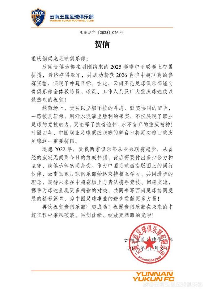 贺信重庆铜梁龙足球俱乐部:欣闻贵俱乐部在刚刚结束的2025赛季中甲联赛上奋勇拼搏,最终夺得亚军,并成功斩获2026赛季中超联赛的参赛资格,实现了冲超目标。在此,云南玉昆足球俱乐部谨向贵俱乐部全体教练员、球员、工作人员及广大重庆球迷致以最热烈的祝贺!绿茵场上,贵队以坚韧不拔的斗志、默契协同的配合,一路披荆斩棘,用汗水浇灌出胜利的果实,不仅展现了职业足球的竞技魅力,更诠释了执着追梦、永不言弃的重庆精神!时隔四年,中国职业足球顶级联赛的舞台也将再次迎回重庆足球这一重要拼图。遥想2022年,贵我两家俱乐部从业余联赛起步,从曾经的寂寂无闻到今日的终成梦想,背后需要付出多少努力和坚守,我俱乐部感同身受。作为中国足球西南版图上的同行伙伴,云南玉昆足球俱乐部始终秉持相互学习、共同进步的理念,期待未来在中超赛场上与贵队携手竞技、切磋交流,携手为球迷呈现更多精彩的对决,共同书写西南足球协同发展的精彩篇章,为中国足球事业的进步贡献更多力量!再次祝贺贵俱乐部冲超成功!祝愿贵俱乐部在未来的中超征程中乘风破浪、再创佳绩、绽放更耀眼的光彩!云南玉昆足球俱乐部2025年11月8日(贺信完)2022赛季中冠,云南玉昆夺冠,重庆铜梁龙获得亚军,两队共同进军职业联赛。如今两队将在下赛季的中超联赛再度展开正面交锋。