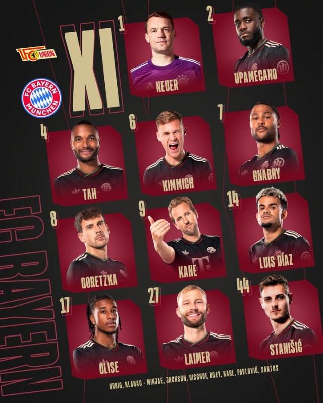 拜仁首发:凯恩、路易斯迪亚斯出战