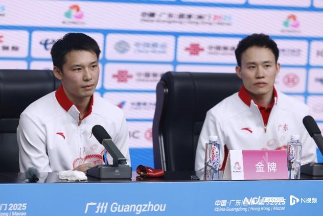 陈艾森(左)、谢思埸在广东队夺得本届全运会跳水男团冠军后参加新闻发布会。南都N视频记者 黎湛均 摄