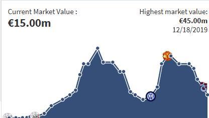 奥纳纳的身价巅峰出现在2019年12月18日,当时他效力于阿贾克斯,身价来到了4500万欧。从国米加盟曼联后,他的身价又迎来了第二次高峰,达到了4000万欧元,不过自那以后,奥纳纳的身价就一路下滑,目前已经来到了1500万欧。本赛季租借加盟特拉布宗体育后,奥纳纳坐稳了球队首发,一共为球队出场12次,甚至还有1次助攻的数据。【上咪咕独家看英超】